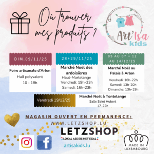 Je n’ai pas de boutique physique et vous pourrez retrouver mes produits sur LETZSHOP.LU plateforme mise en place par le Grand Duché du Luxembourg. 100% sécurisé avec service de livraison au top!