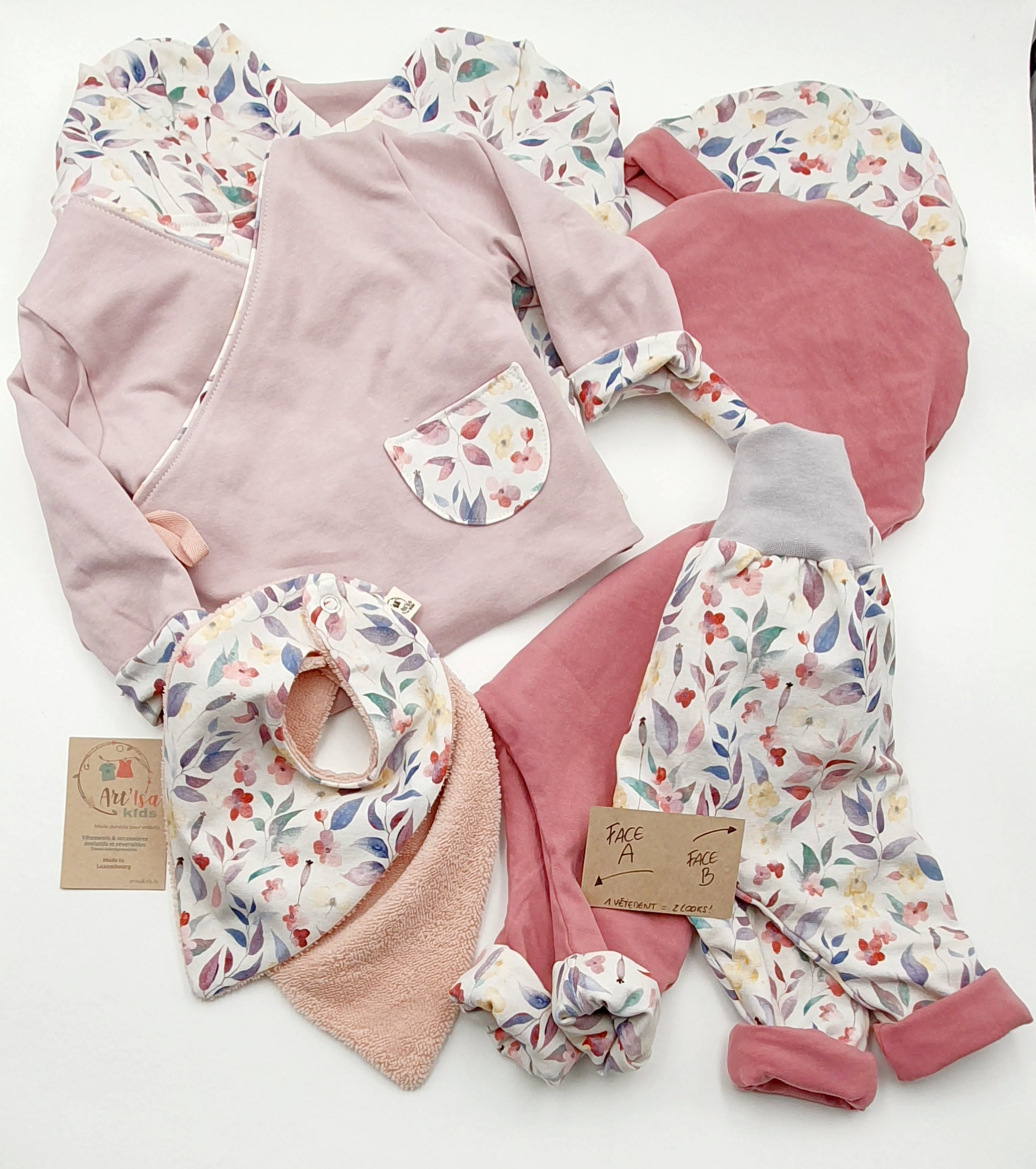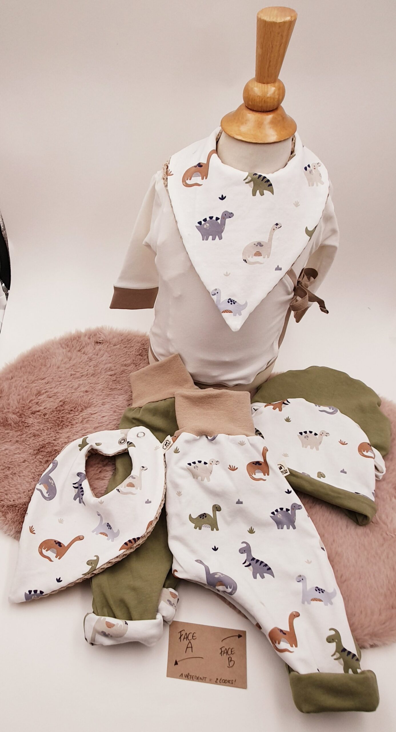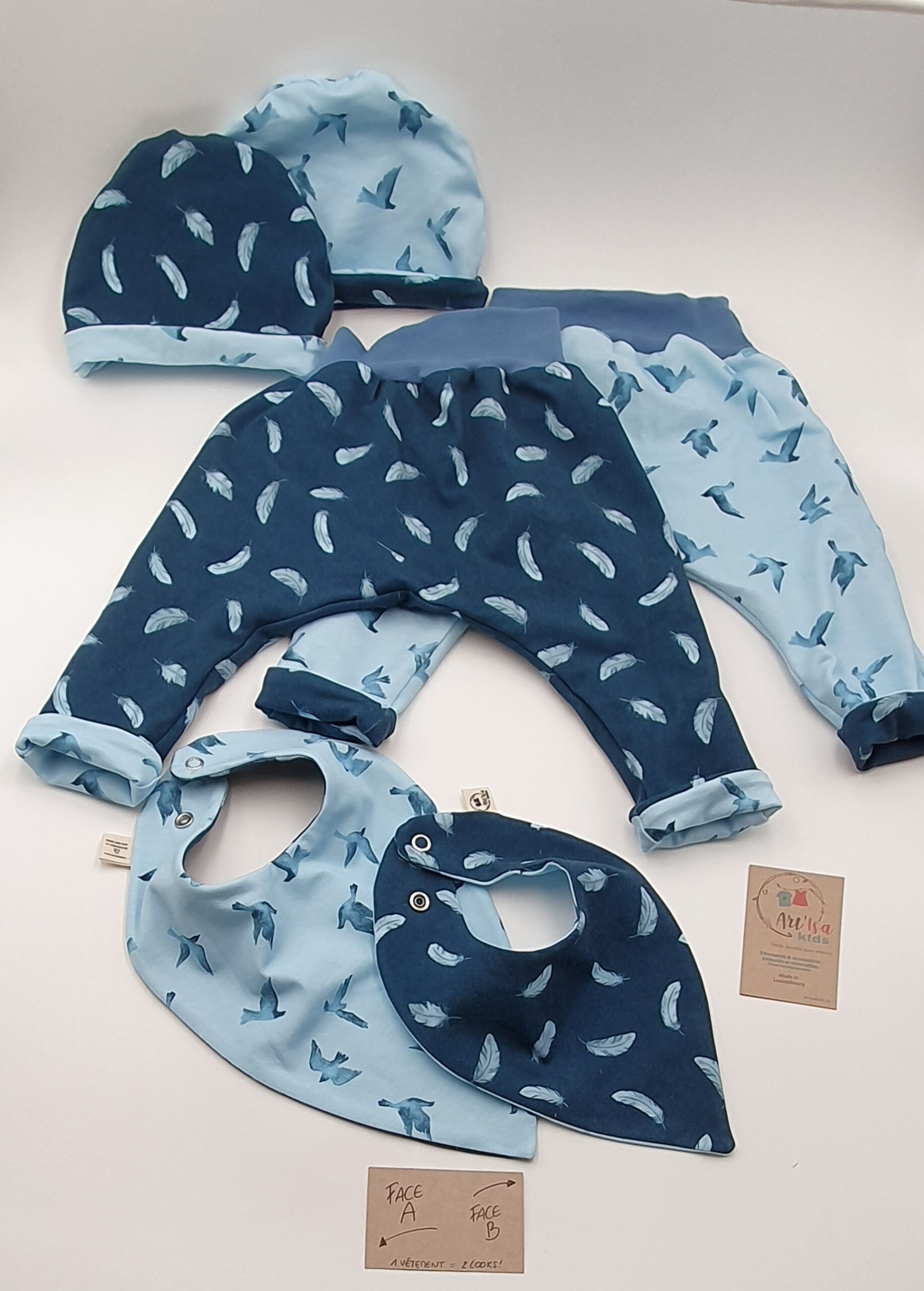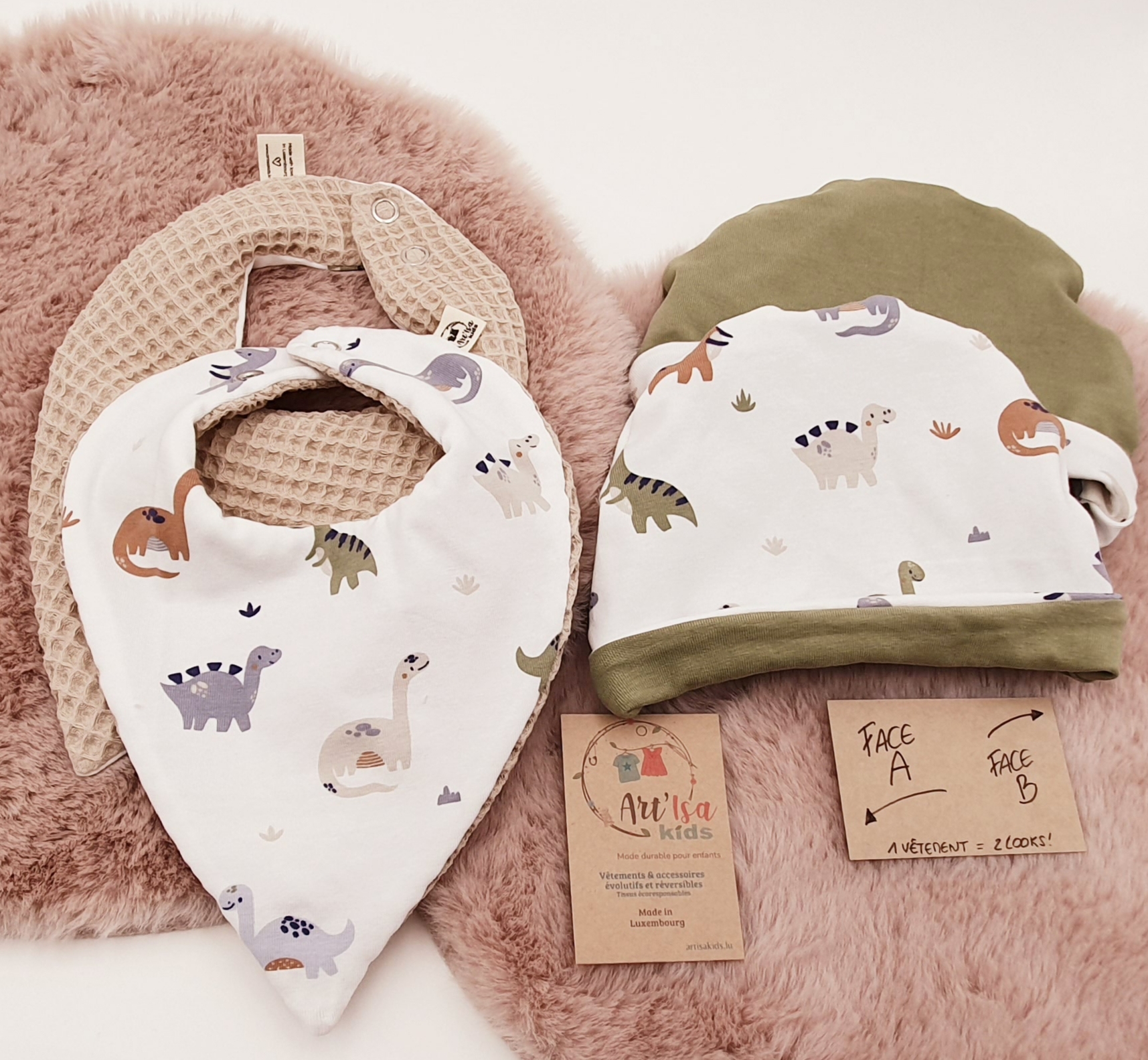 Bonnet réversible et bandana assorti. En fonction des collections, le bandana est composé de jersey sur les deux faces ou d'éponge de bambou ou de nid d'abeille. Ces matières sont plus absorbantes (idéales pour les bébés qui régurgitent).