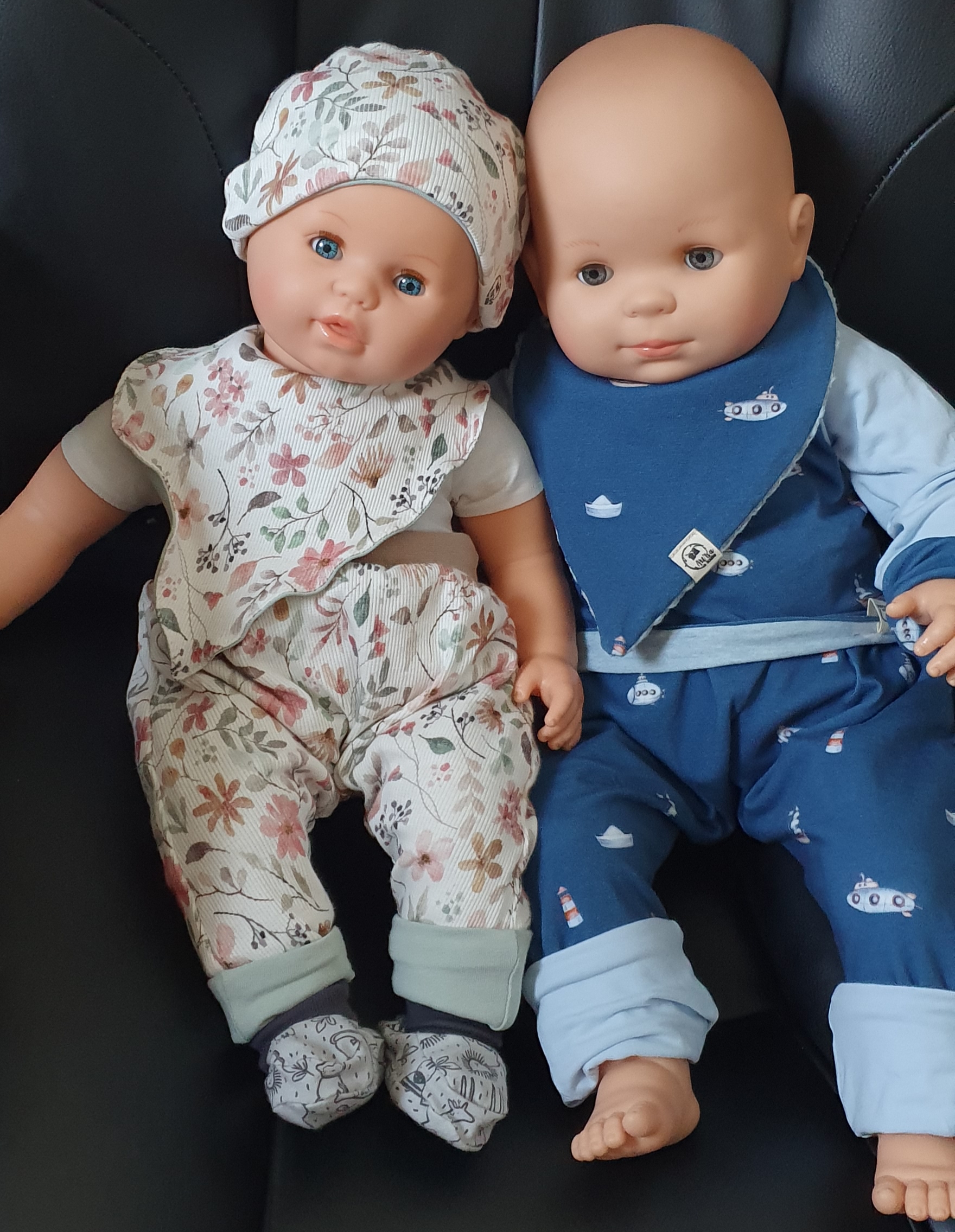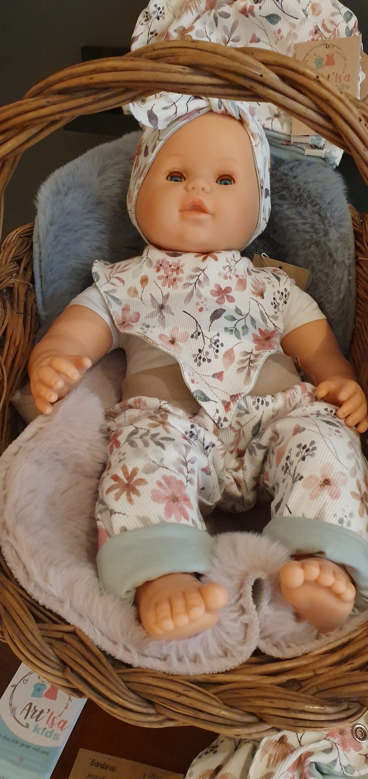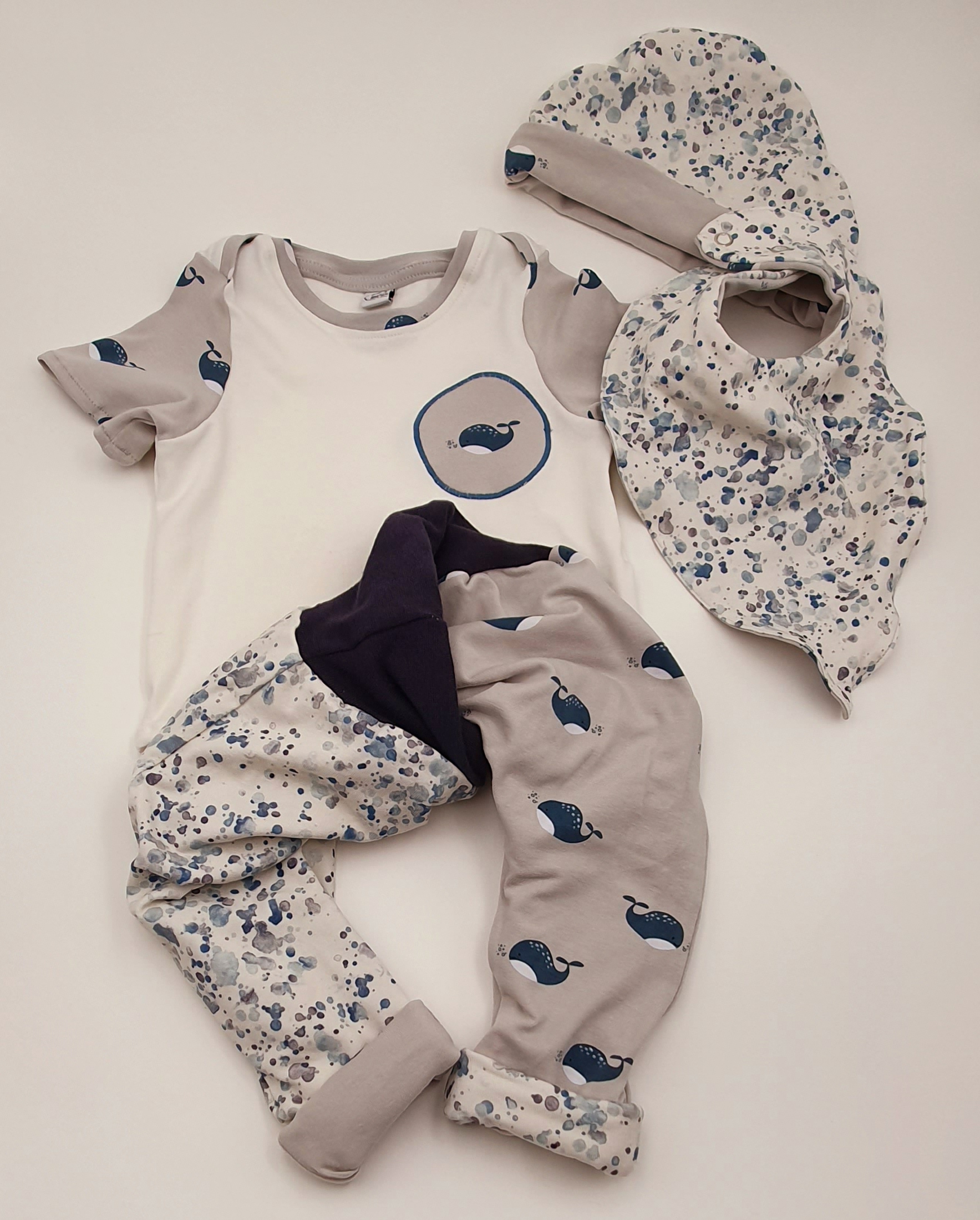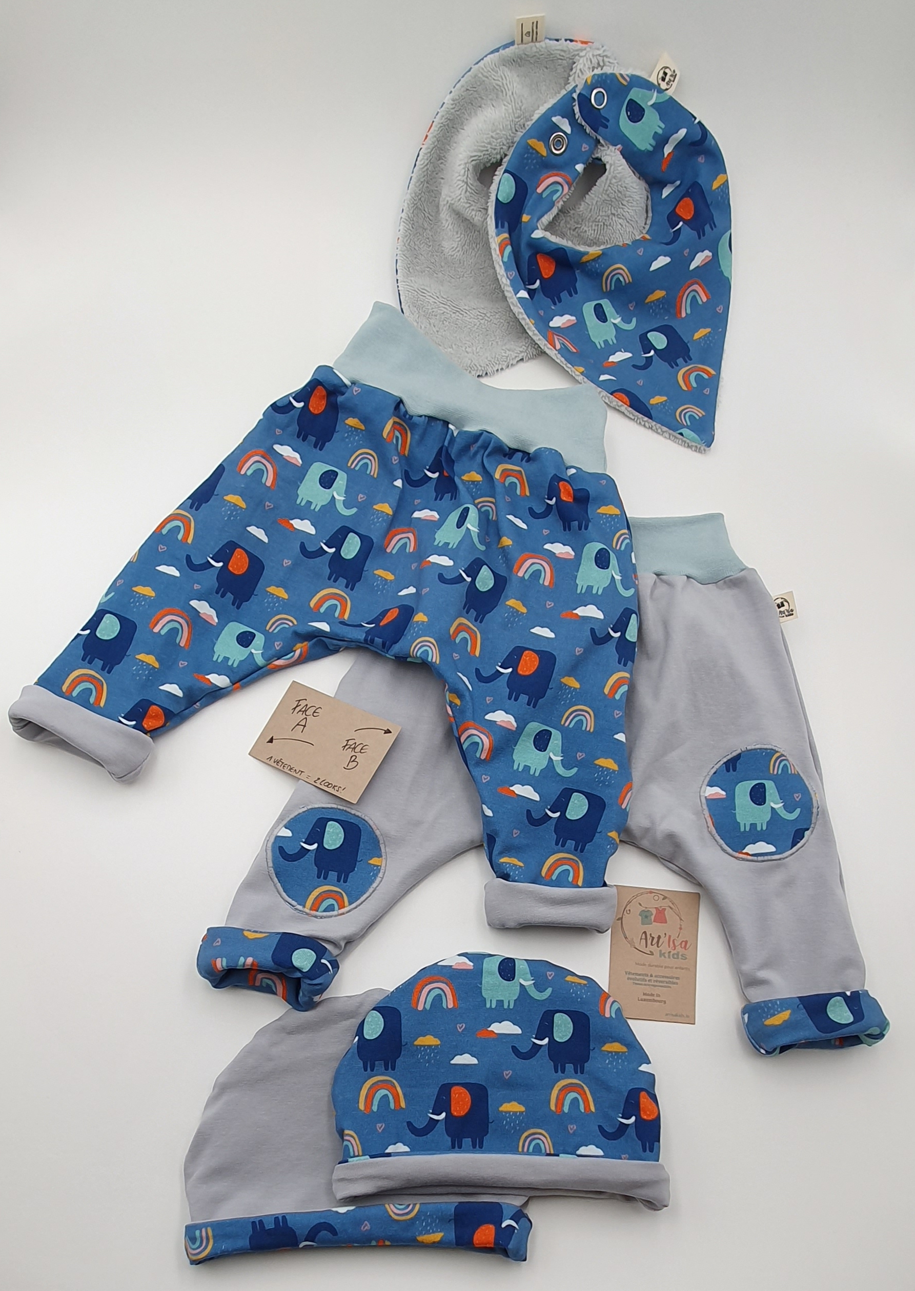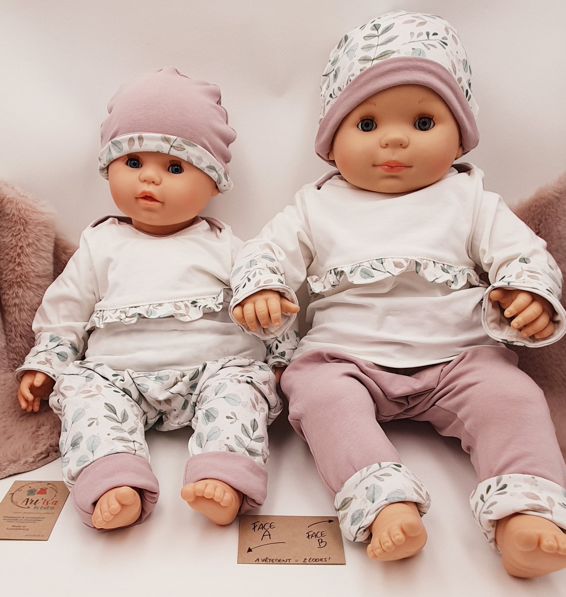Bonnet réversible et bandana assorti. En fonction des collections, le bandana est composé de jersey sur les deux faces ou d'éponge de bambou ou de nid d'abeille. Ces matières sont plus absorbantes (idéales pour les bébés qui régurgitent).