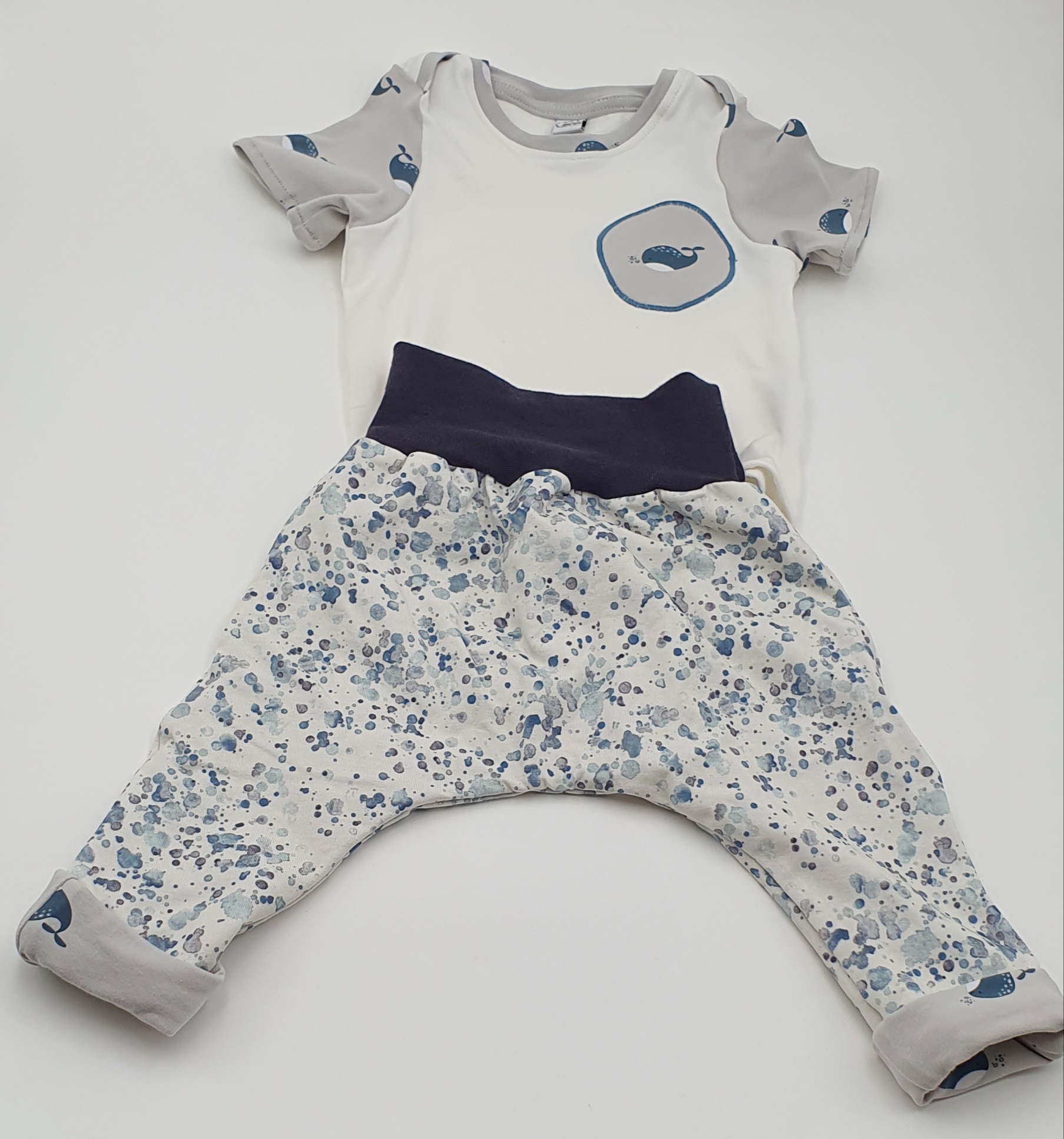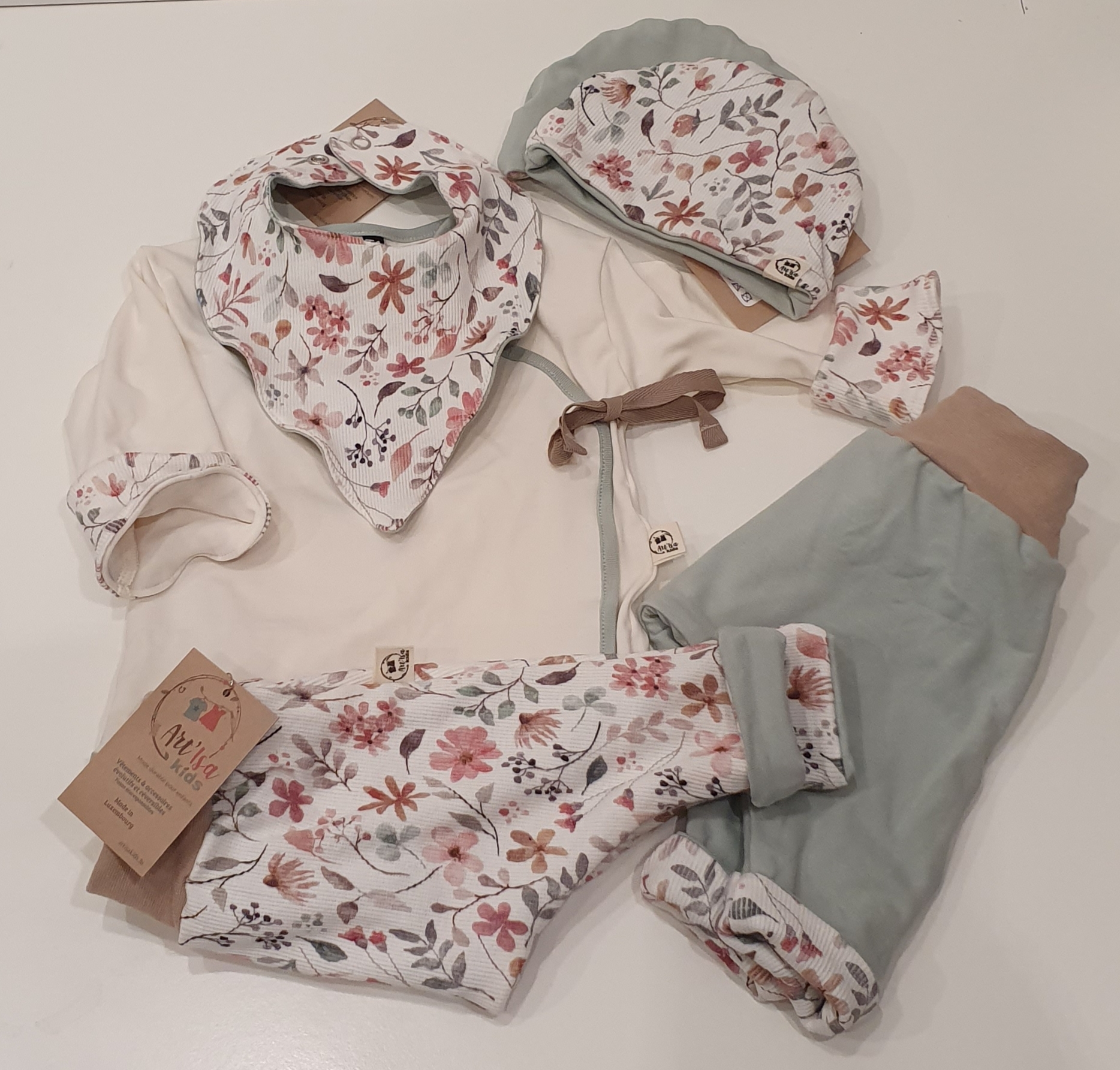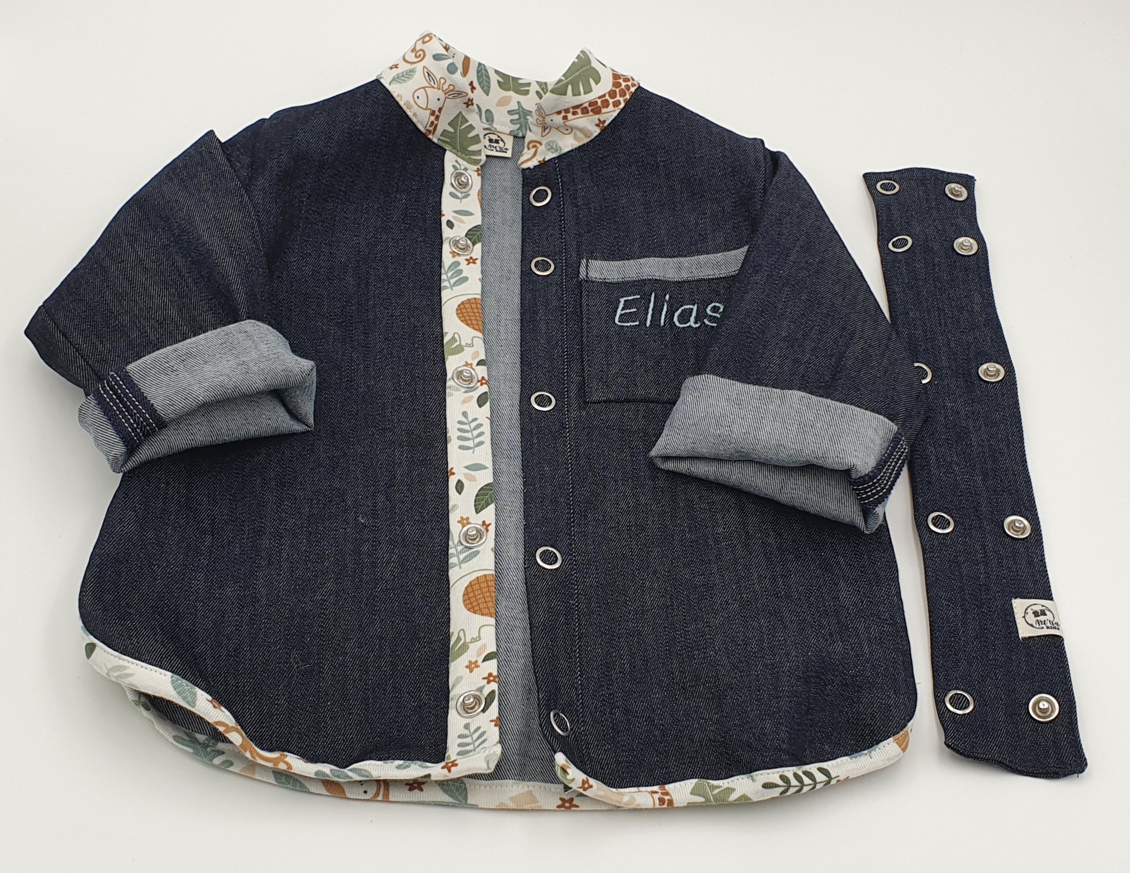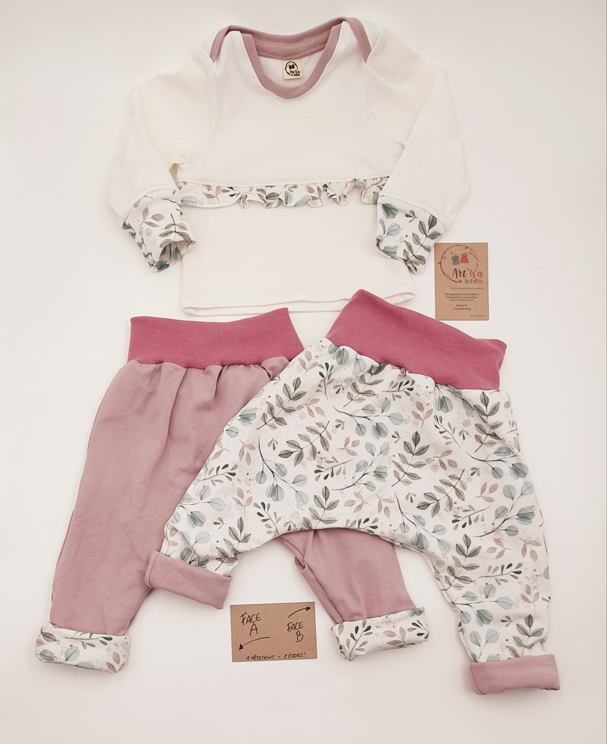 Bonnet réversible et bandana assorti. En fonction des collections, le bandana est composé de jersey sur les deux faces ou d'éponge de bambou ou de nid d'abeille. Ces matières sont plus absorbantes (idéales pour les bébés qui régurgitent).