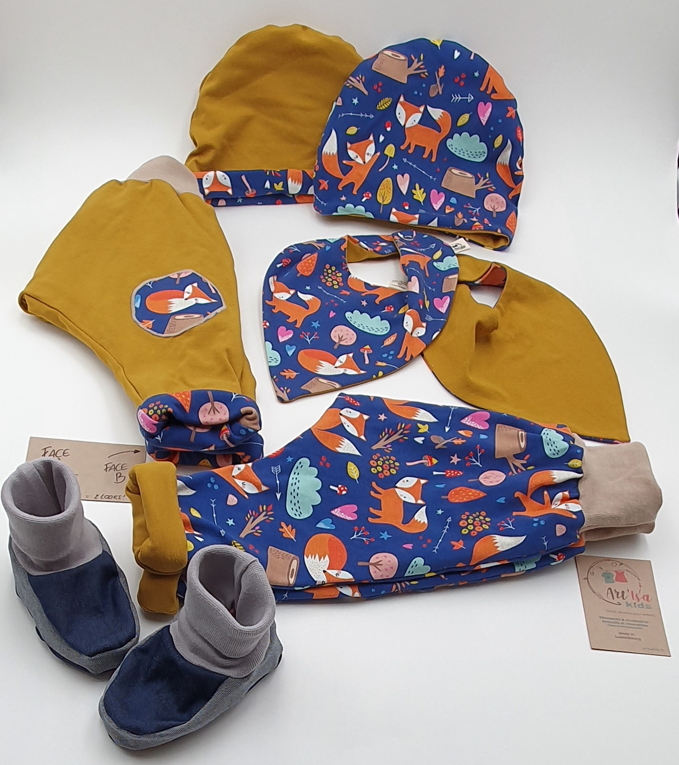 Clin d’oeil au Luxembourg avec cette petite collection fabriquée à 99% au Luxembourg: Le Lion rouge a été métamorphosé en « gentil lion » par une designeuse luxembourgeoise. Le tissus a été imprimé en France (Alsace) et les vêtements fabriqués de manière artisanale au Luxembourg.