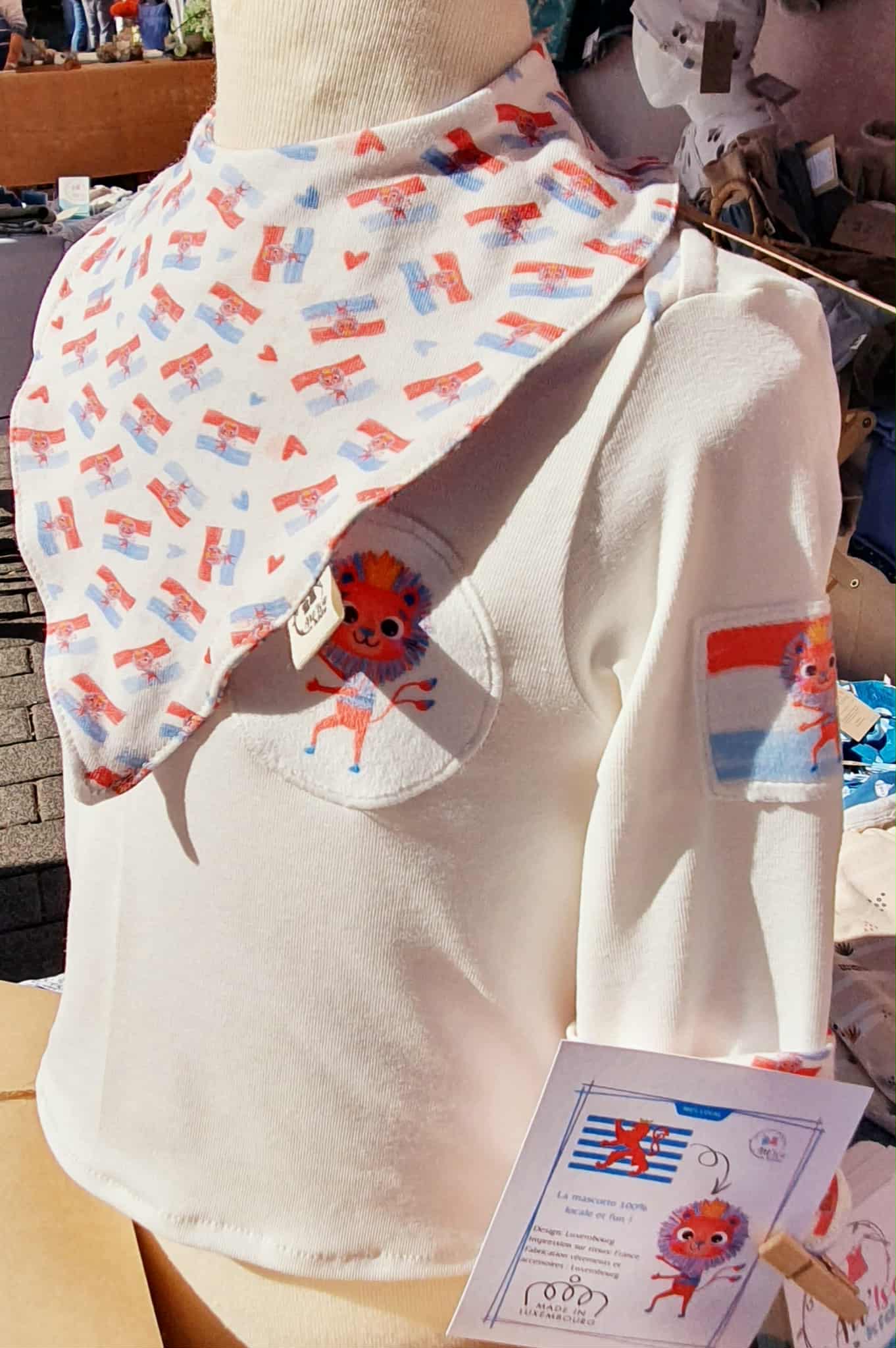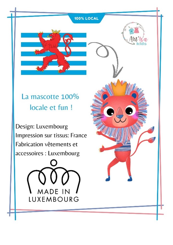 Clin d’oeil au Luxembourg avec cette petite collection fabriquée à 99% au Luxembourg: Le Lion rouge a été métamorphosé en « gentil lion » par une designeuse luxembourgeoise. Le tissus a été imprimé en France (Alsace) et les vêtements fabriqués de manière artisanale au Luxembourg.