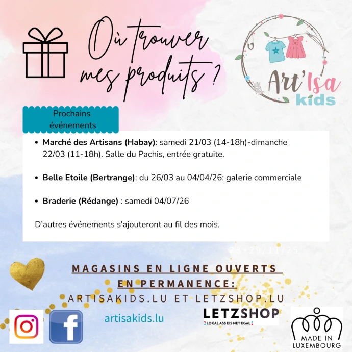 Popupstore Arlon (chaque année depuis 2021), marché Avioth (08/2021), Luxfashion Arlon (10/2021+09/2022), Festival Tontegrange à Tontelange (05/2022 et 2024), Bettie fait son marché, Long Live the Summer (Luxexpo Luxembourg 2022, 2024), Marché de Noël d’Arlon (2022,2023, 2024, 2025), Fierkelsmaart Rambrouch (02/04/2023), Marché de Noël des Ardoisières (11/2023, 2024, 2025), Galerie la Belle Etoile (03/2024, 2025), Kroppemansfest à Rédange (09/2023, 2024, 2026), Braderie Rédange (07/2025), PWC (event privé 2024, 2025), Foire artisanale d'Arlon (11/23, 24, 25)…